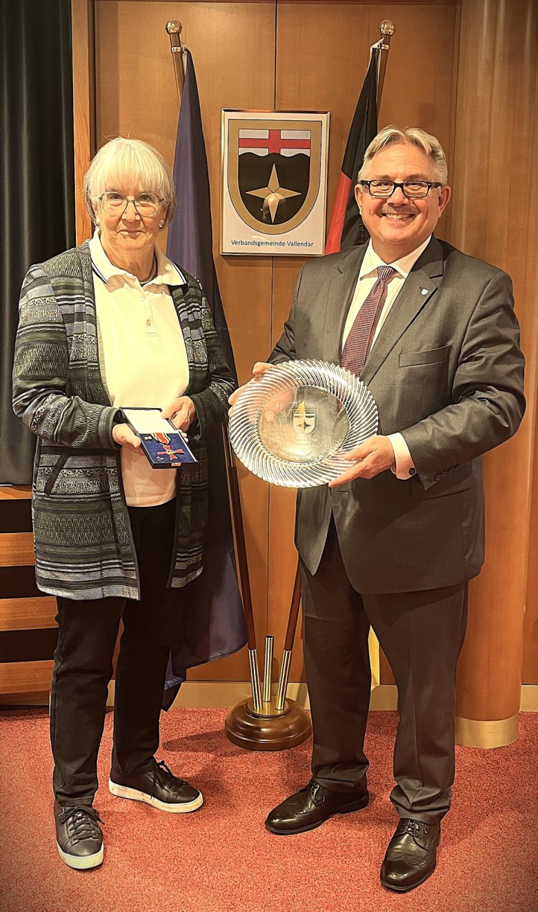 Da bei diesem Anlass Vertreter der jeweiligen Heimatkommunen nicht anwesend waren, ließ es sich der Bürgermeister der Verbandsgemeinde Vallendar Adolf T. Schneider nicht nehmen, Heidrun Walburg ins Rathaus der Verbandsgemeinde Vallendar einzuladen und ihr persönlich und im Namen der Bürgerinnern und Bürger der Verbandsgemeinde zu gratulieren. In dem Gespräch erläuterte sie sowohl ihr ehrenamtliches Engagement als auch die Atmosphäre bei der Verleihungszeremonie in Andernach. Zur Erinnerung und als Zeichen der Wertschätzung für herausragendes ehrenamtliches Engagement überreichte Bürgermeister Schneider der Trägerin des Bundesverdienstkreuzes den Wappenteller der Verbandsgemeinde.