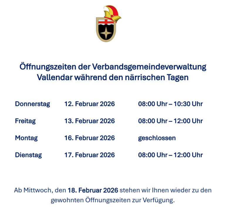 Öffnungszeiten der Verbandsgemeindeverwaltung Vallendar während den närrischen Tagen